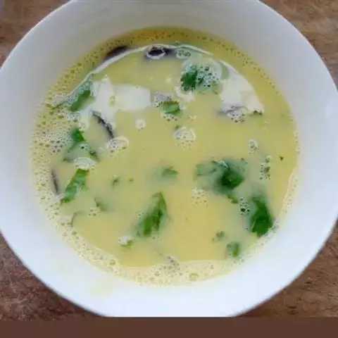 ③将蛋清打散加入芡汁中,边倒边拌成细蛋花。
