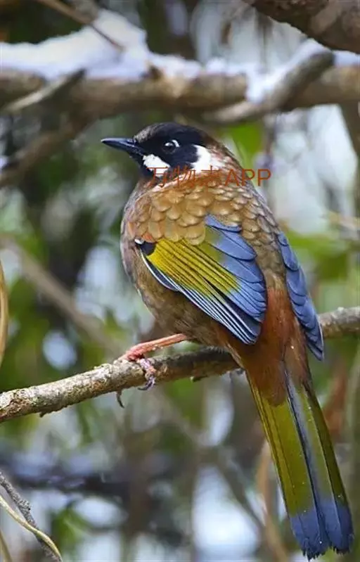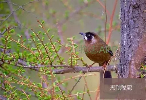 黑顶噪鹛(学名:Garrulax affinis):中型鸟类,体长24-26厘米。前额、脸、颏、喉黑色,头顶黑褐沾棕或深棕橄榄褐色,背栗褐或棕褐色,颧斑白色或棕红色,眼后缘和颈侧亦具白斑,飞羽金黄橄榄色而具蓝灰色尖端。下体淡棕褐色。