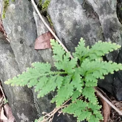土生或石生,直立或匍匐,直立能育茎高10-20厘米,具匍匐茎。根托沿匍匐茎断续孢生,但只生直立茎下部,自茎分叉处下方生出,长0.5-3.5厘米,纤细,直径0.1-0.3毫米,根少分叉,被毛。茎羽状分枝,不呈“之”字形,无关节,禾秆色,下部直径0.4-1.2毫米,茎圆柱状,具沟槽,无毛,维管束1条,直立能育茎自下部开始分枝,侧枝3-5对,1-2回羽状分枝,小枝稀疏,规则,茎上相邻分枝相距1.5-6厘米,分枝无毛,背腹压扁,茎在分枝部分中部连叶宽3-6毫米,末回分枝连叶宽2.4-5.6毫米。叶全部交互排列,二形,草质,表面光滑,无虹彩,边缘不为全缘,不具白边。茎上的腋叶较分枝上的大,卵圆形,近心形,分枝上的腋叶对称,卵形或长圆形,1.4-2.6毫米×0.4-1.2毫米,边缘有细齿。中叶不对称,分枝上的中叶卵形或卵状披针形,1.0-1.6毫米×0.4-0.8毫米,相互排列不是非常近,背部不呈龙骨状,先端外展或与轴平行,先端具尖头或短芒,基部楔形,边缘具微齿。侧叶不对称,主茎上的明显大于侧枝上的,侧枝上的侧叶长圆状卵圆形,外展或下折,排列疏或密,1.8-2.7毫米×0.7-1.8毫米,先端急尖。边缘有细齿,上侧基部扩大,加宽,覆盖小枝,上侧基部边缘有细齿,下侧基部圆形,具细齿。孢子叶穗紧密,背腹压扁,单生于小枝末端,5-25毫米×1.5-3.5毫米;孢子叶明显二形,倒置,上侧的孢子叶卵状披针形或长圆状镰形,边缘具缘毛或具细齿,背部不呈龙骨状,先端具尖头到芒,上侧的孢子叶具孢子叶翼,孢子叶翼达叶尖,边缘具短睫毛或细齿,下侧的孢子叶卵状披针形,边缘具缘毛,先端具长尖头,龙骨状,脊上具睫毛;大孢子叶分布于孢子叶穗上下两侧的基部,或大、小孢子叶相间排列。大孢子橘黄色;小孢子橘黄色。