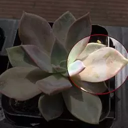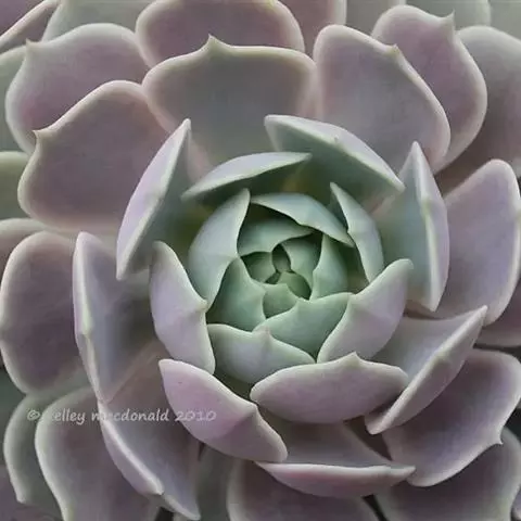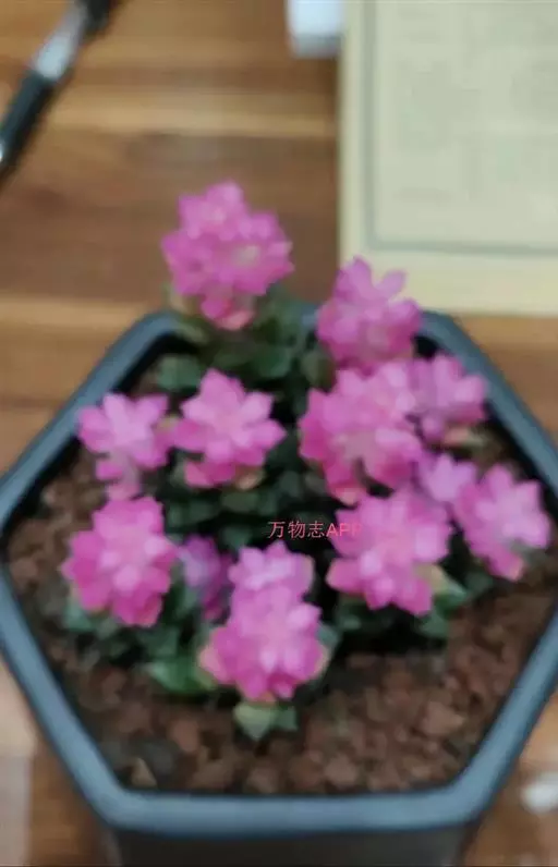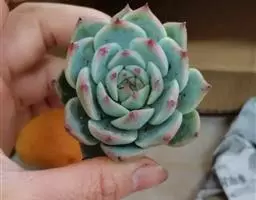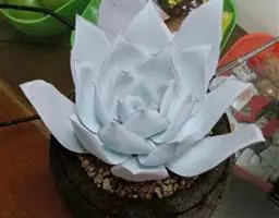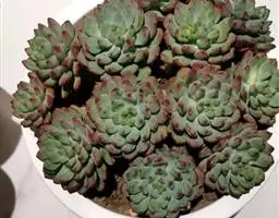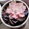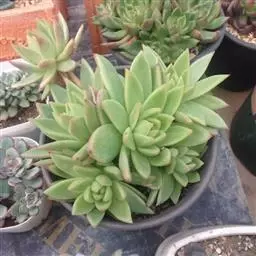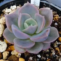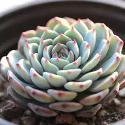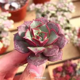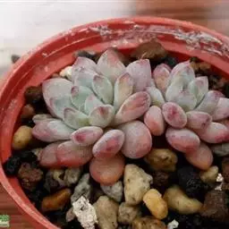 花乃井拟石莲花属多肉植物,植株小型或微型,直径在3-5厘米,叶片肉质肥厚,匙形,有短柄或无柄,轮生,排列紧密,形成莲座状,蓝绿色、或紫色、粉红色,叶片有白粉,叶端钝圆,有小尖,或几乎无尖。易生侧芽,从植株底部长出,容易长成群生株,花期春季。
