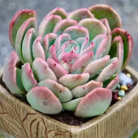 花乃井是景天科拟石莲花属的多肉植物,原产于墨西哥。株型小巧,叶片饱满,在阳光充足、温差大的环境下叶…