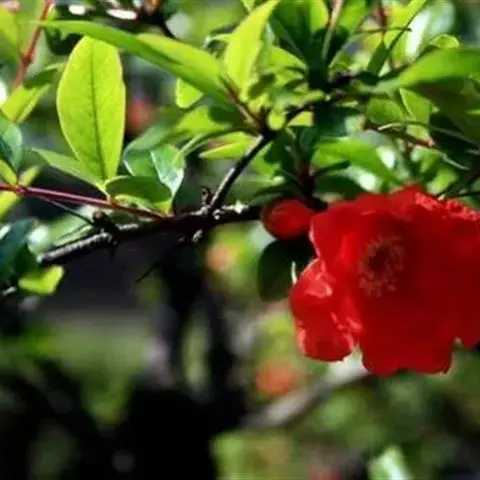 盛开的石榴花 石榴花常用扦插、分株和压条繁殖。扦插,春季选二年生枝条或夏季采用半木质化枝条扦 插均可,插后15~20天生根。分株,可在早春4月芽萌动时,挖取健壮根蘖苗分栽。