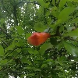 石榴是落叶灌木或小乔木。株高2~5m,高达7m。树干灰褐色,有片状剥落,嫩 枝黄绿光滑,常呈四棱形,枝端多为刺状,无顶芽。单叶对生或簇生,矩圆形或倒卵形,长2~8cm不等,全缘,叶面光滑,短柄,新叶嫩绿或古铜色。花朵至数朵生于枝顶或叶腋;花尊钟形,肉质,先端6裂,表面光滑具腊质,橙红色,宿存。花瓣5~7枚红色或白色,单瓣或重瓣。浆果球形,黄红色。种子多数具肉质外种皮,9~10月果熟。石榴栽培种分果石榴和花石榴两大类。