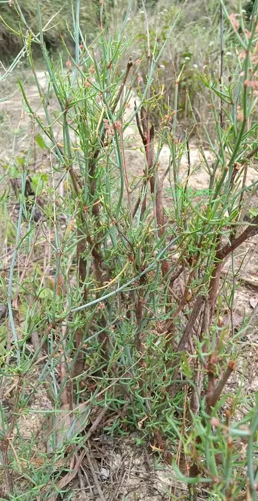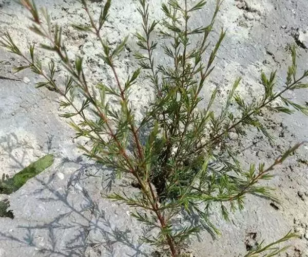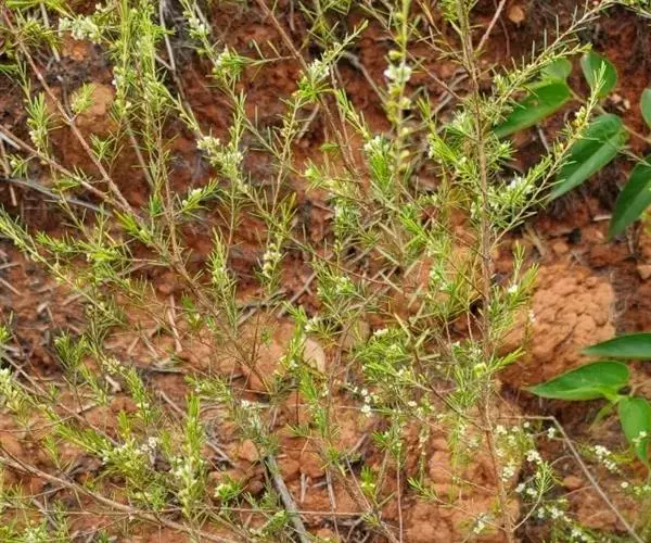 小乔木或灌木状,多分枝,高达1.5米;全株无毛。叶对生,无柄或有短柄,直立或斜展,线形,长0.5-1厘米,宽约1毫米,先端尖,中脉在上面凹陷,在下面突起,有透明腺点。花小,黄白色,单生叶腋,径2-3毫米。花梗长约1毫米,基部有2小苞片,苞片早落,花长1-1.5毫米萼筒钟形,长约1.5毫米,萼齿5,膜质,细小,三角形,近宿存;花瓣5,近圆形,分离,长约1.5毫米,基部窄成短柄;雄蕊(8)10,成对与萼齿对生;短于花瓣;子房下位,3室,每室有2胚珠,花柱短,宿存。蒴果长1-2毫米。种子扁平,有角。花期夏秋。
