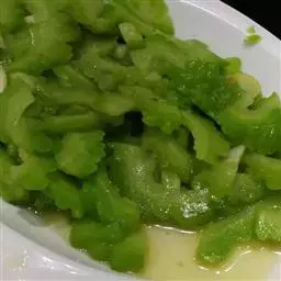 苦瓜片用盐少许稍腌,轻轻挤去部分水分,然后再炒,苦味少而味道鲜。