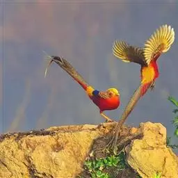 叫声:孔雀雉叫声宏亮、高昂,似“guanggui--guanggui(光贵)”,傣语称之为“诺光贵”,是因为“诺”是傣语中“鸟”的意思。雄鸟占域叫声为响亮的trew-tree爆破音。雌鸟告警时发出响亮的ga-ga声或作快速的ok-kok-kok-kok叫。