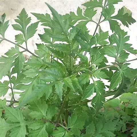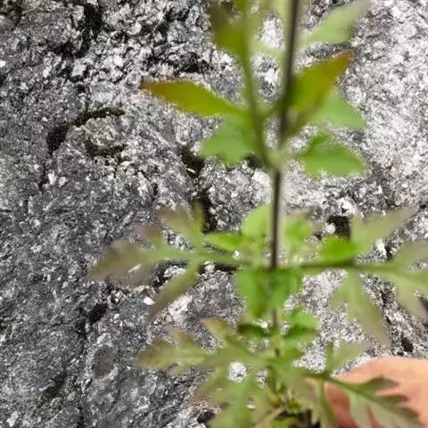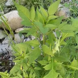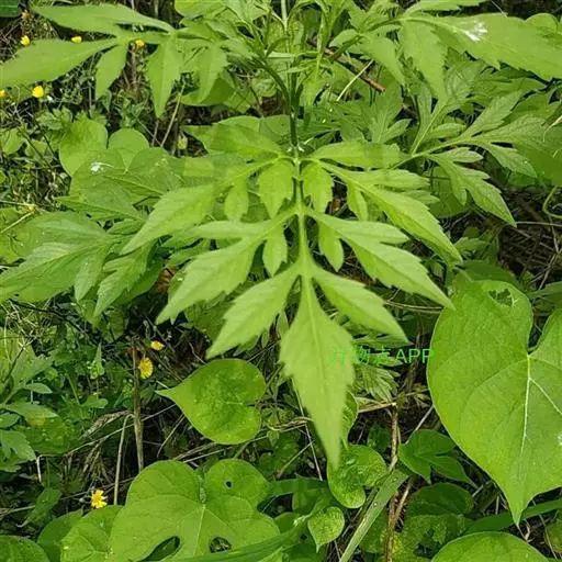 茎下部叶较小,3裂或不分裂,通常在开花前枯萎,中部叶具长1.5~5厘米无翅的柄,三出,小叶3枚,很少为具5 (-7) 小叶的羽状复叶,两侧小叶椭圆形或卵状椭圆形,长2-4.5厘米,宽1.5-2.5厘米,先端锐尖,基部近圆形或阔楔形,有时偏斜,不对称,具短柄,边缘有锯齿、顶生小叶较大,长椭圆形或卵状长圆形,长3.5-7厘米,先端渐尖,基部渐狭或近圆形,具长1-2厘米的柄,边缘有锯齿,无毛或被极稀疏的短柔毛,上部叶小,3裂或不分裂,条状披针形。