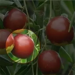 七月鲜 果实卵圆形,果面平整,平均果重29.8克,最大74.1克。果个均匀,果皮薄,深红色,表面蜡质较少。可溶性固形物含量28.9%,可食率98.8%。鲜枣味甜,肉质细,极宜鲜食,8月下旬红熟,比梨枣早上市20-30天,克服了梨枣采前落果严重,未红先蔫的缺点。该品种抗旱性强,丰产稳产,是极为可贵的极早熟优良鲜食品种。