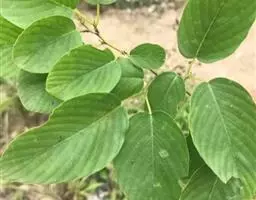 叶纸质,卵形,卵状椭圆形,或卵状矩圆形;长3-7厘米,宽1.5-4厘米,顶端钝或圆形,稀锐尖,具小尖头,基部稍不对称,近圆形,边缘具圆齿状锯齿,上面深绿色,无毛,下面浅绿色,无毛或仅沿脉多少被疏微毛,基生三出脉;叶柄长1-6毫米,或在长枝上的可达1厘米,无毛或有疏微毛;托叶刺纤细,后期常脱落。