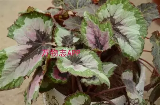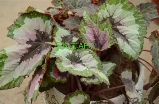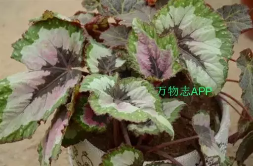 蟆叶海棠(学名:紫叶秋海棠,拉丁学名:Begonia rex Putz.)为秋海棠科秋海棠属多年生草本植物。高17-23厘米。根状茎圆柱形,呈结节状,周围长出密集细长之根。叶均基生,具长柄,花2朵,生于茎顶,蒴果3翅,一翅特大,呈宽披针形。产云南、贵州、广西。生于山沟岩石上和山沟密林中,海拔990-1100米。越南北部、印度东北部和喜马拉雅山区也有分布。