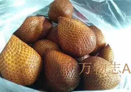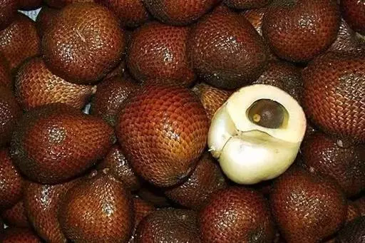 功效:蛇皮果的果肉是白中带黄色,咬下去是很爽脆的感觉,而肉质很乾硬,非常的酸涩。蛇皮果果肉含对人体皮肤有益成分,印尼本地姑娘经常将它作为美容水果食用。它是水果中钾含量最高的品种之一,果胶含量也很丰富,对人脑十分有益,有“记忆之果”的美誉。