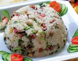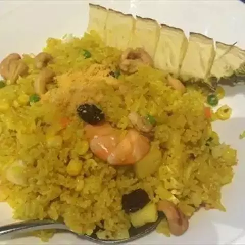 菠萝炒饭是将带皮菠萝纵切,用勺子将菠萝肉取出,切成小丁,与米饭、火腿、鸡蛋、新鲜蔬菜等一起在油锅中翻炒,炒好的米饭用菠萝壳装即可食用。该饭具有酸甜可口,营养丰富的特点,特别适合儿童食用。