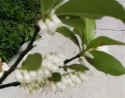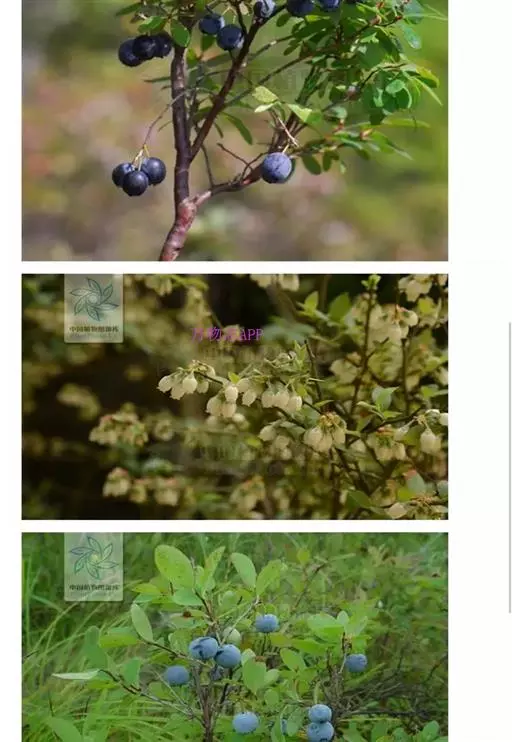 花下垂,1-3朵着生于去年生枝顶叶腋;花梗0.5-1厘米,顶端与萼筒之间无关节,下部有2小苞片,小苞片着生处有关节;萼筒无毛,萼齿4-5,三角状卵形,长约1毫米;花冠绿白色,宽坛状,长约5毫米,4-5浅裂;雄蕊10,比花冠略短,花丝无毛,药室背部有2距。浆果近球形或椭圆形,直径约1厘米,成熟时蓝紫色,被白粉。花期6月,果期7-8月。