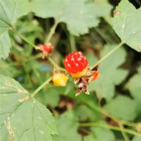 掌叶覆盆子的采收时问为5月中旬至6月上旬,此时果实已充分发育且呈现绿色,尚未转红成熟,当果实呈鲜红色、略带香气时,适时采收。采收时分批进行,采下后,除去梗、叶、花托和其它杂质,然后倒人沸水中烫2-3分钟再捞出,随后摊晒或烘干。成品以果粒完整、色呈黄绿、略带酸味、无梗叶屑者为佳。一般在16:00后采收为宜,切忌在早晨和雨天进行。