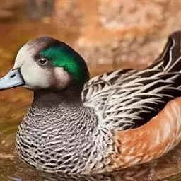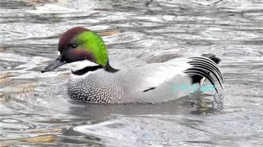 罗纹鸭(学名:Anas falcata)是中型鸭类,体型略较家鸭为小,体长40-52厘米,体重0.4-1千克。雄鸭繁殖期头顶暗栗色,头侧、颈侧和颈冠铜绿色,额基有一白斑;颏、喉白色,其上有一黑色横带位于颈基处。三级飞羽甚长,向下垂,呈镰刀状;下体满杂以黑白相间波浪状细纹;尾下两侧各有一块三角形乳黄色斑。明显有别于其他鸭类,野外容易鉴别。雌鸭略较雄鸭小,上体黑褐色,满布淡棕红色‘U’形斑。下体棕白色,满布黑斑。主要以水藻、水生植物嫩叶、种子、草子、草叶等植物性食物为食。繁殖在西伯利亚东部、远东、中国黑龙江省和吉林省。越冬在中国、朝鲜、日本、中南半岛、缅甸、印度北部。