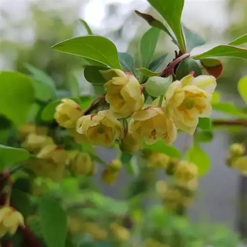 庐山小檗(学名:Berberis virgetorum Schneid.)是小檗科,小檗属落叶灌木,高可达2米。幼枝紫褐色,老枝灰黄色,茎刺单生,偶有三分叉,叶薄纸质,长圆状菱形,叶缘平展,有时稍呈波状;总状花序,花梗细弱,无毛;苞片披针形,花黄色;外萼片长圆状卵形,内萼片长圆状倒卵形,花瓣椭圆状倒卵形,浆果长圆状椭圆形,熟时红色,花期4-5月,果期6-10月。