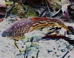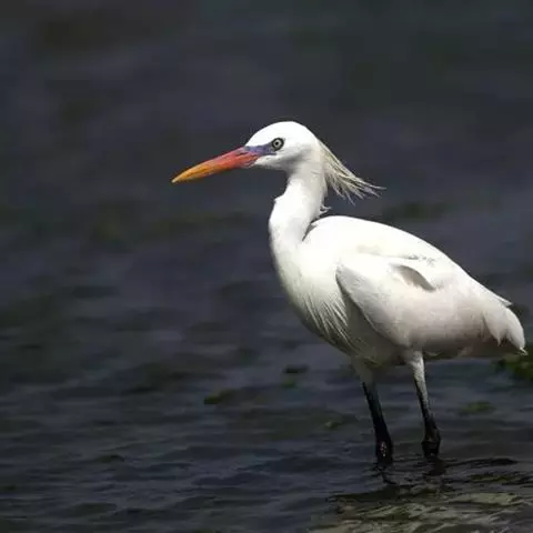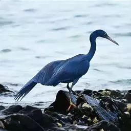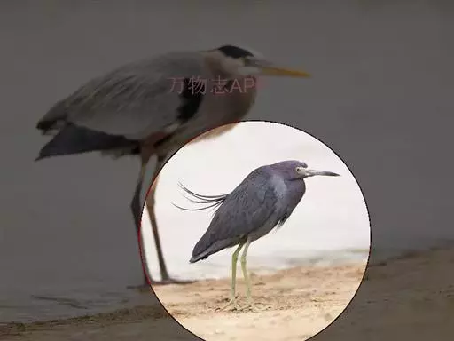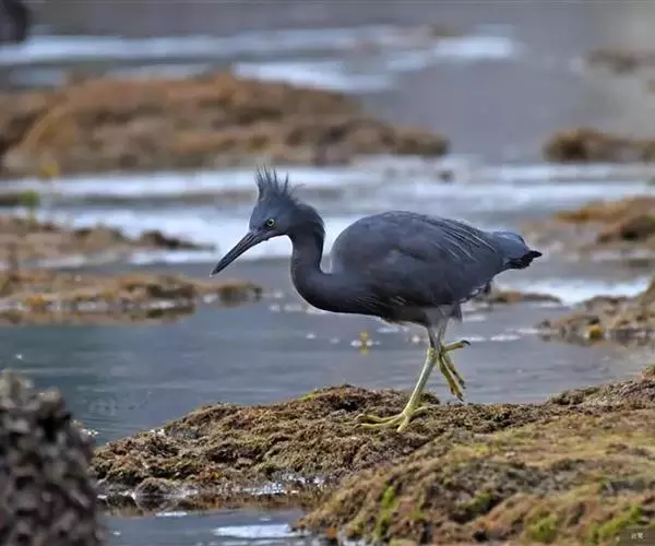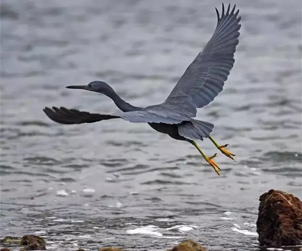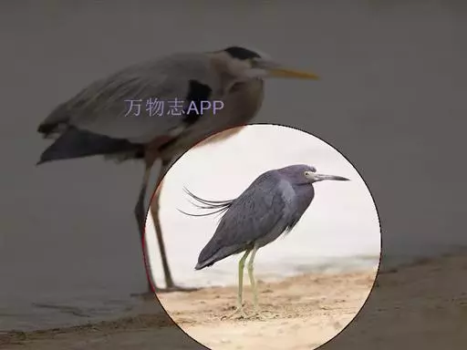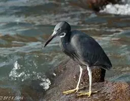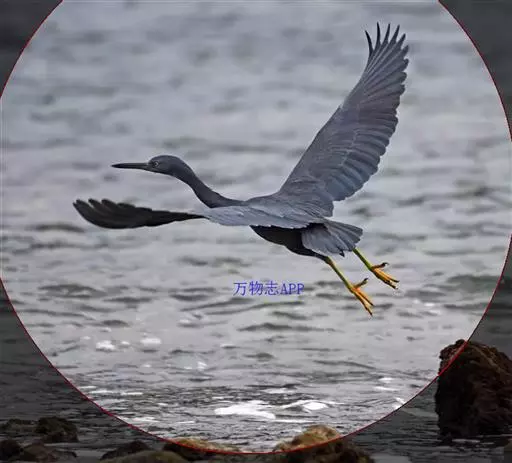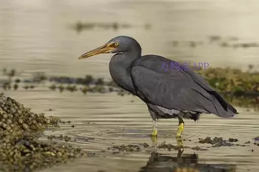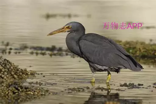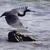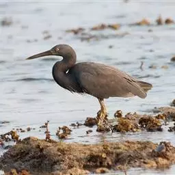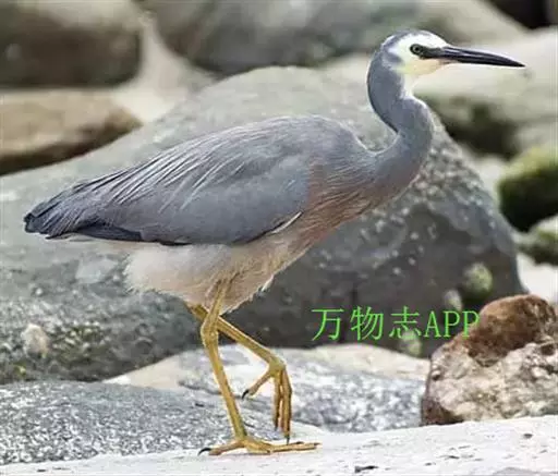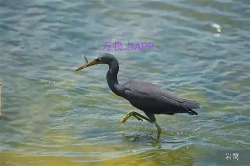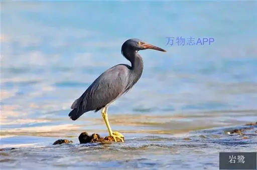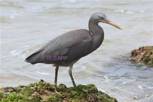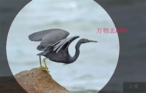 岩鹭(学名:Egretta sacra):中型涉禽,体长60-75厘米,翼长25-30毫米,体重330-700克。嘴较长而粗钝,颈长,脚较粗短,体色有白色和黑色两种色型。黑色型较常见,体羽清一深灰色并具短冠羽,近白色的颏在野外清楚可见。白色型与牛背鹭的区别在体型较大,头及颈狭窄。与其他鹭的区别为腿偏绿色且相对较短,嘴浅色,习性也不同。虹膜黄色;嘴浅黄;脚绿色。