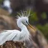 白色型全身的羽毛洁白无瑕,脸部裸露的皮肤为黄绿色,眼睛和嘴通常为黄色,脚为黄绿色,趾为黄色,繁殖期间头后部和前颈下部生有长的披针形饰羽,背部有长的蓑羽,但仅抵达尾羽的基部。冬季头部、背部和前颈的饰羽消失。它与体羽也是白色的白鹭、黄嘴白鹭等难以区别,只有嘴较为粗厚,直到先端才变细的特点较为突出,不象白鹭或黄嘴白鹭的嘴那样逐渐变细变尖,另外它们还有两点主要的不同:一是岩鹭的脚较为粗短,胫下部裸露的部分少,飞行时脚超出尾羽的部分也少,而白鹭和黄嘴白鹭的脚较为细长,胫下部裸露得多,飞翔时脚远远超出尾羽的外面;二是白鹭和黄嘴白鹭背部蓑羽均超过了尾羽的端部,而岩鹭则仅达到尾羽的基部。 [4-5]