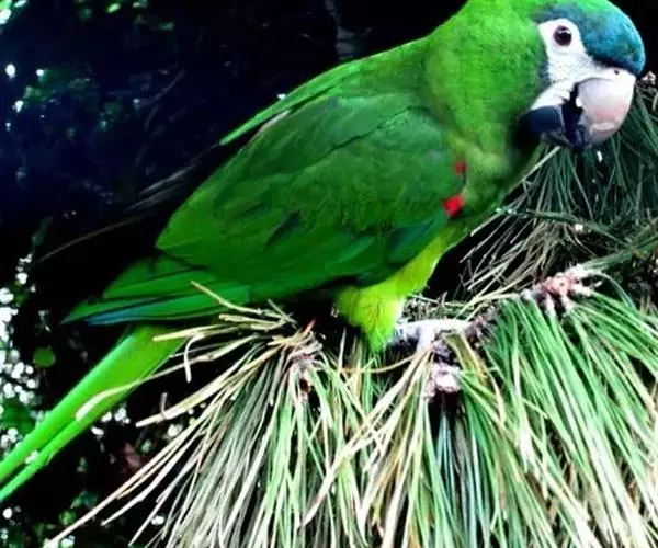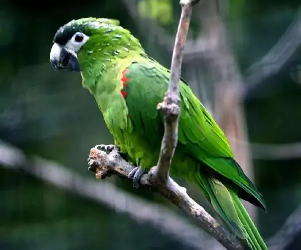 红肩金刚鹦鹉体长30-34厘米,体重130-170克。鸟体为绿色,停栖落时看起来全部是绿色,翼下覆羽为红色。面部有裸皮是所有金刚鹦鹉的特点,通常为白色。雄鸟的头比雌鸟大而圆。鸟喙呈黑色,另一种贵族品种的喙为褐色,只有尖端为黑色。幼鸟羽色比成鸟暗淡,头部有少许蓝羽毛,有些雏鸟长成时翅上有一点点红羽毛。平均寿命20年。红肩金刚鹦鹉是所有的金刚鹦鹉中体型最小的,可爱的模样非常讨人喜爱。 [1-2]