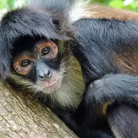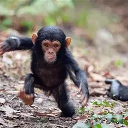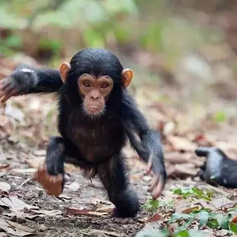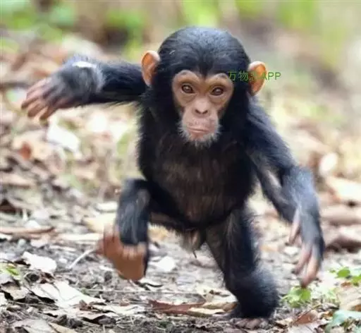 黑猩猩(学名:Pan troglodytes):人科 ,体长70-92.5厘米,站立时高1-1.7米,体重雄性56-80千克,雌性45-68千克;身体被毛较短,黑色,通常臀部有1白斑,面部灰褐色,手和脚灰色并覆以稀疏黑毛;幼猩猩的鼻、耳、手和脚均为肉色;耳朵特大,向两旁突出,眼窝深凹,眉脊很高、头顶毛发向后;手长24厘米;犬齿发达,齿式与人类同;无尾。