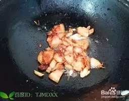 炒锅倒油,大火将锅烧热,将切好的肉片下锅,翻炒至肉片卷曲,肥肉透明最好,这样猪肉的油都被炒出来了,吃起来不腻。