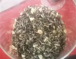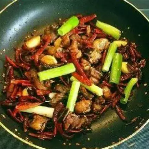 5、.炒锅上火,加很少的油煸香辣椒、花椒