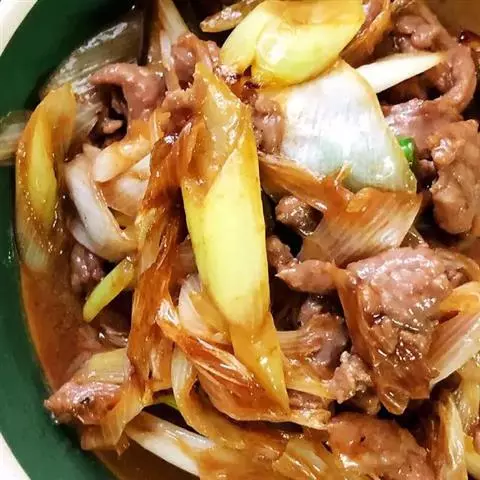 6、肉香四溢后转大火,入青椒,大葱丝煸炒至熟,加适量盐调味。关火。