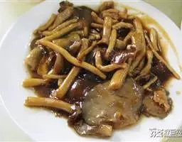 锅内仅放一茶匙油,放入肉片和姜片,用小火慢慢煎炒至出油,表面色泽变金黄色