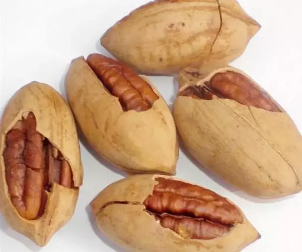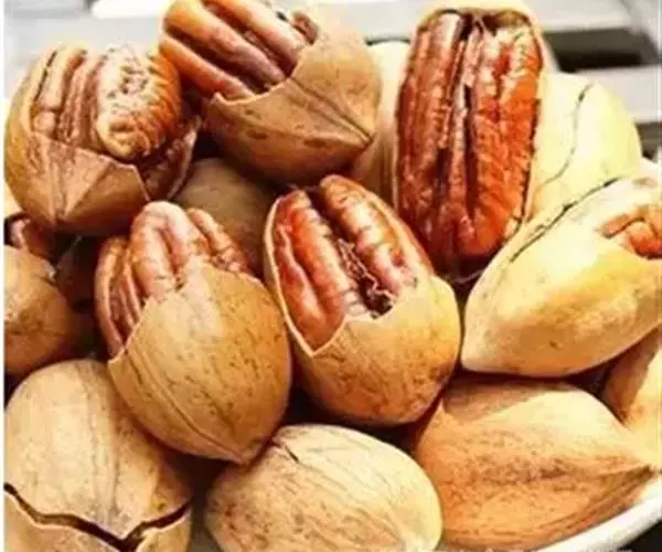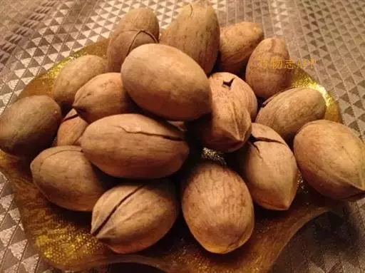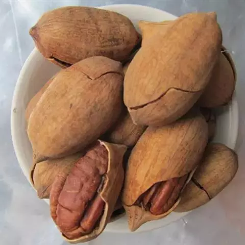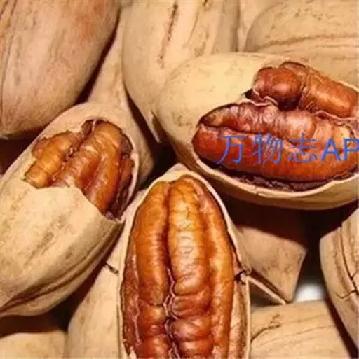 美国山核桃(Carya illinoensis Koch)属胡桃科的山核桃属,又名薄壳山核桃或长山核桃,英文名为Pecan或Hickory,原产北美大陆的美国和墨西哥北部,现已成为世界性的干果类树种之一。由于其种仁有优异的食疗保健价值。比香榧大一号,剥开是像核桃一样的果肉。壳很脆,特别好剥,就跟香榧一样脆,而肉质介于大核桃与小核桃之间。