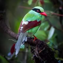 蓝绿鹊:中型鸟类,共有5个亚种。体长36-38厘米。尾长,嘴、脚红色。通体羽色主要为草绿色,…