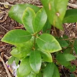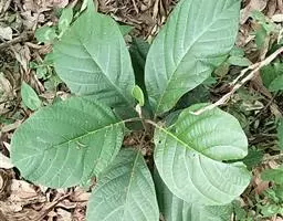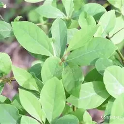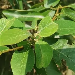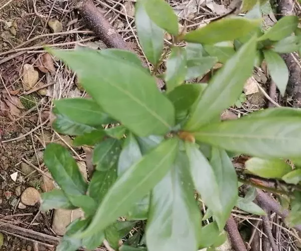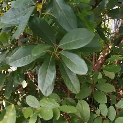 叶散生,叶片卵状长圆形,长2.5-5.5厘米,宽1-2.2厘米,先端钝或短渐尖,基部楔形或钝。薄革质,上面绿色,光亮,无毛,下面粉绿色,无毛,羽状脉,侧脉每边通常3-4条,中脉、侧脉在叶上面下陷,下面突起;叶柄粗短,长3-5毫米,初时有柔毛,以后毛脱落变无毛。