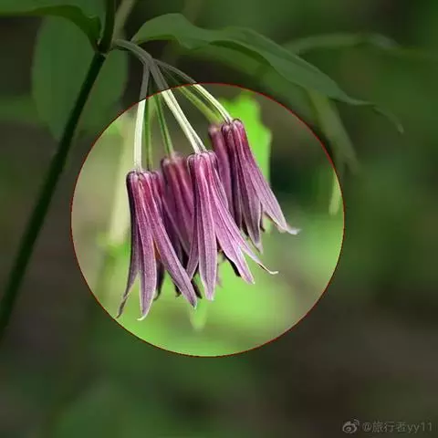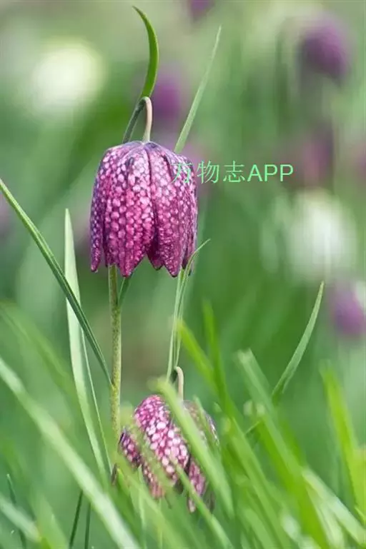 花单生茎顶,钟状,下垂,每花具狭长形叶状苞片3枚,先端多少弯曲成钩状。花被片6,通常紫色,较少绿黄色,具紫色斑点或小方格,蜜腺窝在北面明显凸出;蒴果具6纵翅。花期5-7月,果期8-10月。