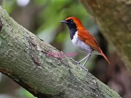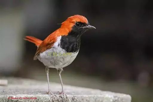 雄鸟从头至尾包括两翅覆羽表面等整个上体橙红色,飞羽暗褐色,外翻具宽的橙红色羽缘。前额、眼先、颊、颏、喉和胸黑色,其余下体白色,两胁有黑斑。
