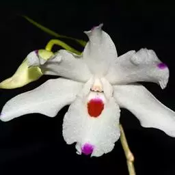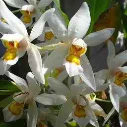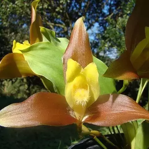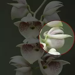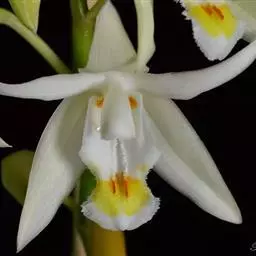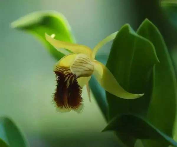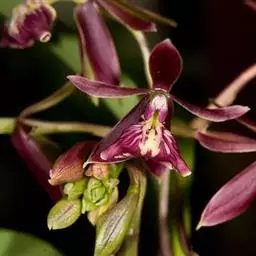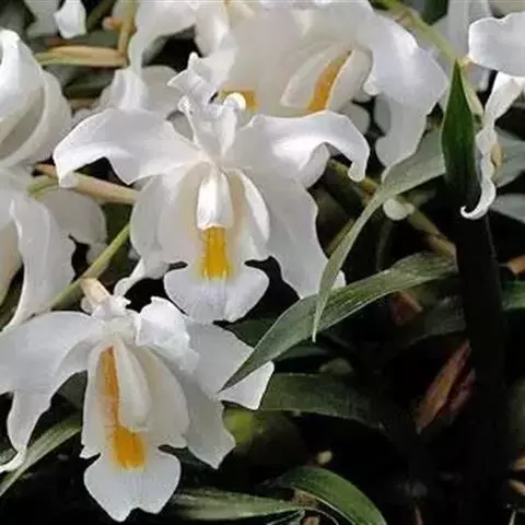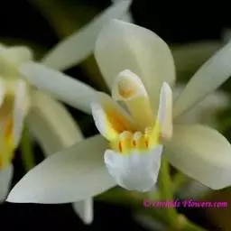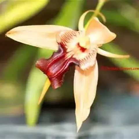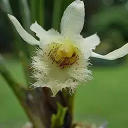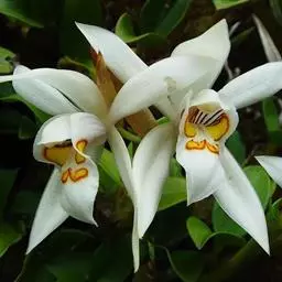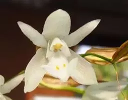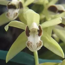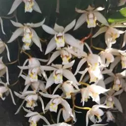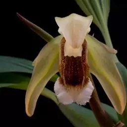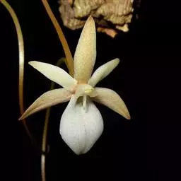 流苏贝母兰(学名:Coelogyne fimbriata Lindl.):根状茎较细长,匍匐,粗1.5-2.5毫米,节间长3-7毫米。假鳞茎狭卵形至近圆柱形,顶端生2枚叶。叶长圆形或长圆状披针形,纸质。花葶从已长成的假鳞茎顶端发出,长5-10厘米;总状花序通常具1-2朵花,花淡黄色或近白色,仅唇瓣上有红色斑纹;花瓣丝状或狭线形,与萼片近等长,宽0.7-1毫米;唇瓣卵形,3裂。蒴果倒卵形。花期8-10月,果期次年4-8月。