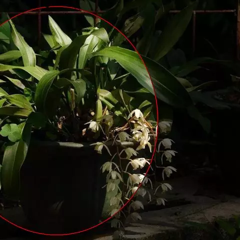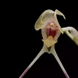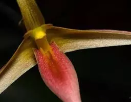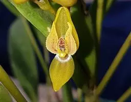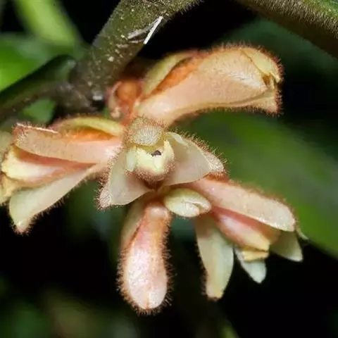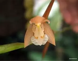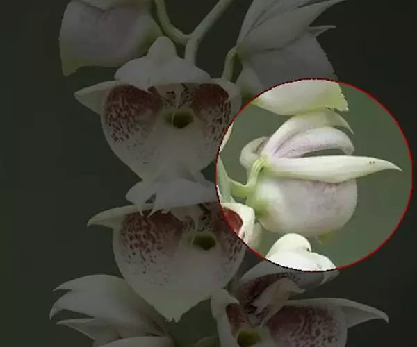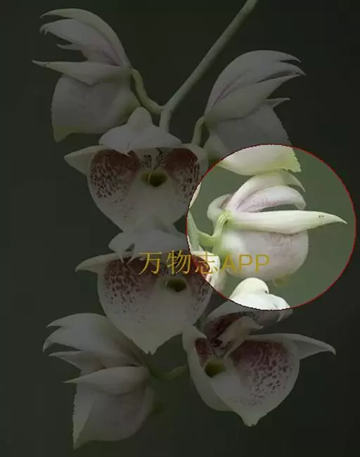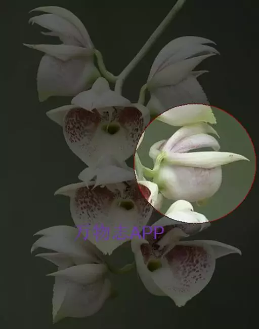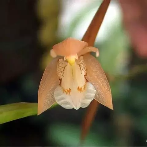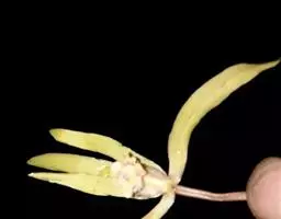 花葶从已长成的假鳞茎顶端发出,长5-10厘米,基部套叠有数枚圆筒形的鞘;鞘紧密围抱花葶;总状花序通常具1-2朵花,但同一时间只有1朵开放;花序轴顶端为数枚白色苞片所覆盖;花苞片早落;花梗和子房长1-1.2厘米;花淡黄色或近白色,仅唇瓣上有红色斑纹;萼片长圆状披针形,长1.6-2厘米,宽4-7毫米。