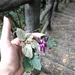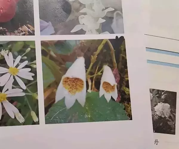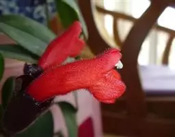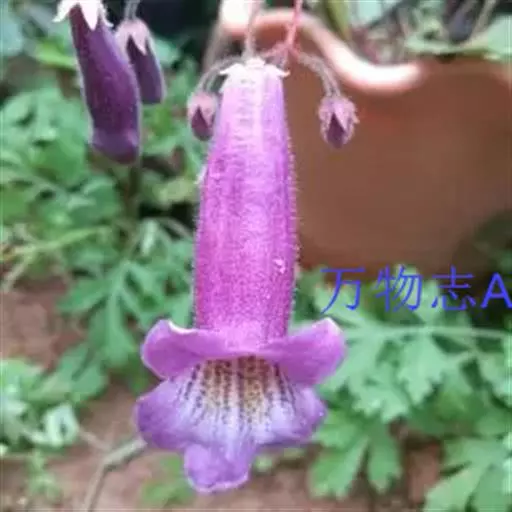 聚伞花序生茎顶端叶腋,花序梗和花梗均被白色柔毛,具1-2花;苞片2(-3),狭线形,长2-4毫米,宽约1毫米,顶端钝或稍渐尖;花梗长1-1.3厘米。花萼5裂至近基部,裂片线状披针形,长1-1.8厘米,宽2-3毫米,顶端长渐尖,外面疏生白色贴伏柔毛,内面无毛,多全缘,稀上部具2-3小齿。花冠粗筒状,下方肿胀,长3.8-4.2厘米,黄色,稀白色,外面近无毛;筒长2.8-3厘米,直径1.5-1.8厘米;上唇2裂,裂片近圆形,相等,长约5毫米,下唇3裂,内面具紫色斑点,中央裂片较大,长9-10毫米,侧裂片较小,长2.8-3毫米。上雄蕊长2.5厘米,着生于距花冠基部4毫米处,下雄蕊长3厘米,着生于距花冠基部5毫米处,花丝无毛,花药卵圆形,长1.5-2毫米,药室顶端不汇合;退化雄蕊长约2毫米,着生于距花冠基部3毫米处。花盘环状,高1.5-2毫米,近全缘。
