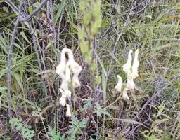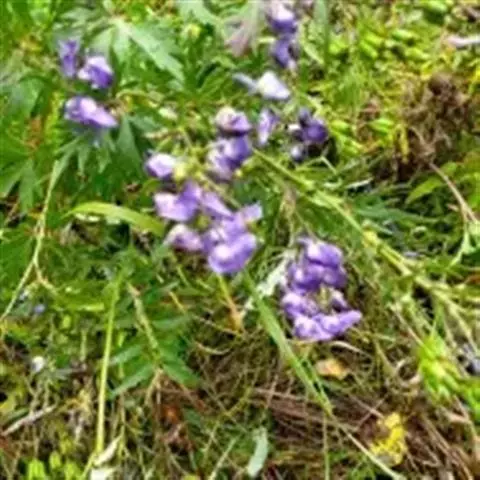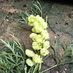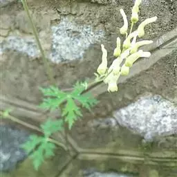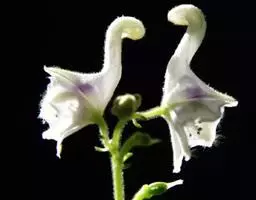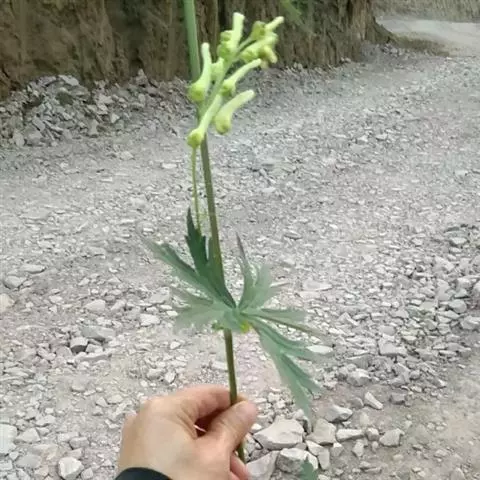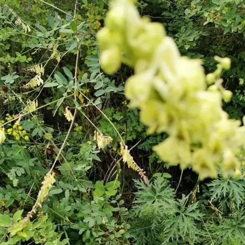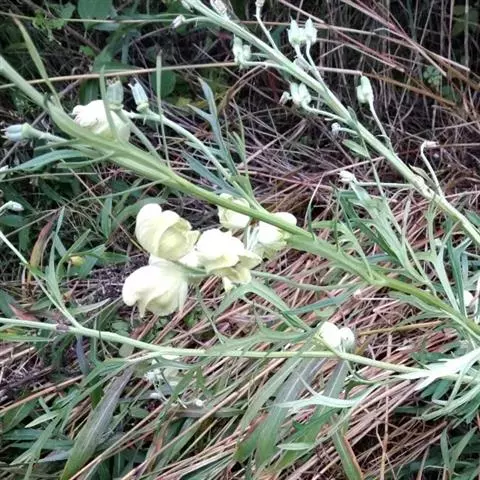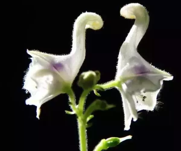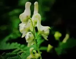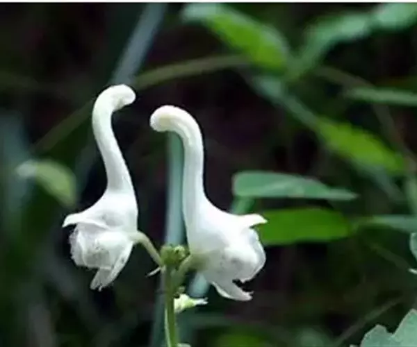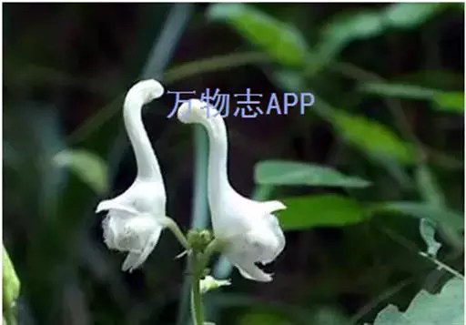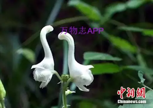 拟两色乌头 拟两色乌头属多年生草本花卉,毛茛科,群居而生,为蔓生植物,春天发芽、秋后枯黄。到了八月,枝蔓上便会冒出一串串花蕾,从蔓条的中部到顶尖依次绽放,花呈乳白色,花色不大,花冠分四瓣,花蕊朝下,上面一瓣最为怪异,花蕊相扣,背部细而带钩,形状像一只只展翅欲飞的天鹅,下面的一瓣生出两脚,极像天鹅腿,“天鹅花”也因此而得名。