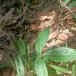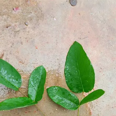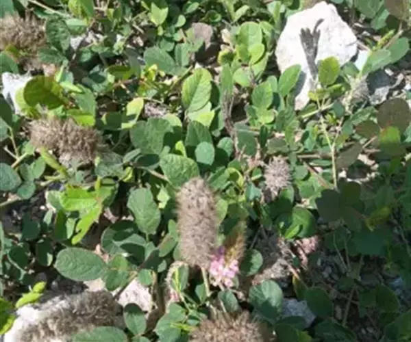 叶多为3小叶,稀兼有单小叶;托叶三角形,长3毫米,宽约1毫米,先端尾尖,被灰黄色长柔和缘毛;叶柄长1-2厘米,有沟槽;小叶纸质,顶生小叶近圆形或椭圆形至卵形,长2-6厘米,宽1.5-3厘米,先端圆形或微凹,有细尖,基部圆形或心形,侧生小叶较小,上面略粗糙,下面被灰黄色短柔毛,侧脉每边5-7条,直而斜展,靠叶缘处微弯拱,两面凸起,网脉在下面明显;小托叶刚毛状,长1.5毫米;小叶柄长约2毫米,密被灰黄色短柔毛。
