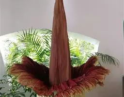 攀援植物,分枝节间淡红色,长3-8厘米,粗1厘米。鳞叶肉质,红色,背面有2条龙骨状突起,长7-10厘米。叶柄腹面扁平,背面圆形,长15-25厘米,粗7-10毫米;叶片纸质,伸长的三角状箭形,长15-25厘米,宽12-18厘米,基部心形,前裂片三角形、半圆形或半卵形,后裂片三角形,I级侧脉4对基出,II级侧脉多数。花序柄长6-7厘米。佛焰苞外面深紫色,内面胭脂红色,兜状舟形,管部卵圆形,长7-8厘米;檐部短卵形,长7厘米,宽4-5厘米,具长约5毫米的尖头,肉穗花序具长约3毫米的梗,雌花序圆柱形,长5厘米,粗1.5厘米,雄花序长10厘米,向上略细。雌蕊倒卵圆形,8室,长约1.5毫米,柱头盘状。雄花通常有雄蕊3。