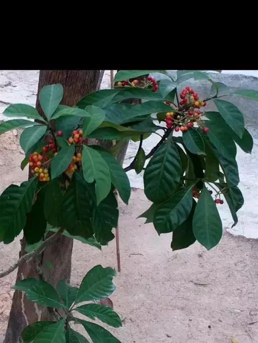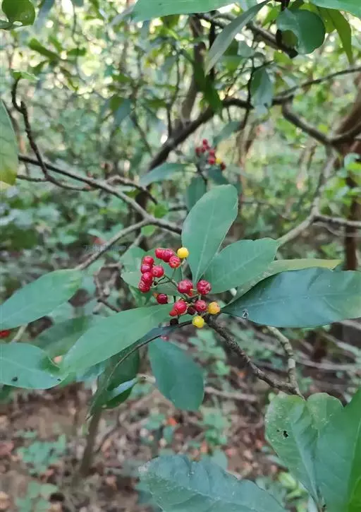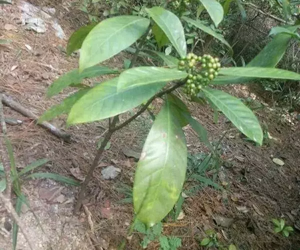 2、灌木或小乔木,高0.5-5米。叶对生,纸质或革质,长圆形、椭圆状长圆形或倒披针状长圆形,稀长圆状倒卵形,有时稍歪斜,长5-23.5厘米,宽2-9厘米,顶端渐尖、急渐尖或短尖而尖头常钝,基部楔形,全缘,鲜时稍光亮,干时常暗红色或在下面褐红色而上面淡绿色,中脉和侧脉在上面凹下,在下面凸起,脉腋内常有束毛,侧脉5-15对,弯拱向上,近叶缘处不明显联结;叶柄长0.7-5厘米,无毛或极稀有极短的柔毛;托叶膜质,短鞘状,顶部不裂,长6-8毫米,宽6-9毫米,脱落。聚伞花序通常顶生,无毛或极稀有极短的柔毛,多花,总花梗常极短,近基部三分歧,常成伞房状或圆锥状,长2-10厘米,宽3-15厘米;花梗长1-2.5毫米;萼管杯状,长约2毫米,宽约2.5毫米,檐部扩大,近截平或不明显地5齿裂;花冠白色,冠管长2-3毫米,宽约2.5毫米,喉部被白色长柔毛,花冠裂片近三角形,长2-2.5毫米,宽约1.5毫米,开放时反折;雄蕊与花冠裂片互生,花药长圆形,伸出,花丝长1-2毫米;柱头2裂,伸出或内藏。核果球形或宽椭圆形,长5-8毫米,直径4-7毫米,有纵棱,红色;果柄长1.5-10毫米;小核背面凸起,具纵棱,腹面平而光滑。花果期全年。
