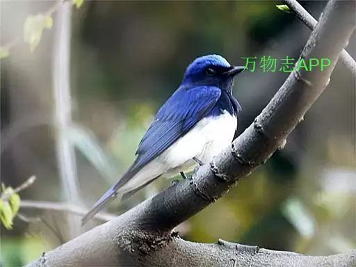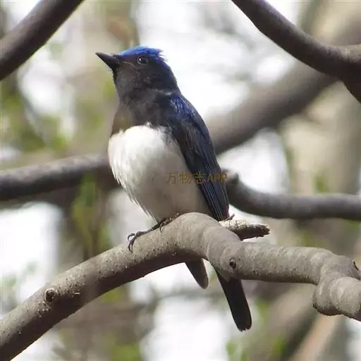白腹蓝鹟(学名:Cyanoptila cyanomelana):体长14-17厘米,小型鸟类。雄鸟头顶钴蓝色或钴青蓝色,其余上体紫蓝色或青蓝色,两翅和尾黑褐色,羽缘颜色同背,外侧尾羽基部白色。头侧、颏、喉、胸黑色,其余下体白色。雌鸟上体橄榄褐色,腰沾锈色,眼圈白色。颏、喉污白色,胸灰褐色,胸以下白色。