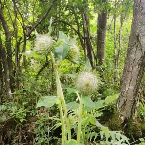中部茎叶长椭圆形或卵状长椭圆形,长4-10厘米,宽2.5-4.5厘米,边缘有大锯齿或圆锯齿,下部沿叶柄下延成具翅的叶柄,柄基扩大贴茎;基生叶及茎下部的叶较大,间或浅裂或深裂,而侧裂片1-2对,极少有3对的,叶柄长达10厘米;上部茎叶渐小,长椭圆形或长披针形,渐无柄,基部扩大贴茎或耳状扩大抱茎,接花序下部的叶边缘有小齿或无齿;全部叶上面无毛,下面沿脉有极稀疏的短柔毛。