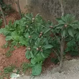 花数朵簇生叶腋;花梗长5-15毫米,被锈色或灰色绢毛;小苞片圆形,径约0.5毫米,毛被同花萼裂片;花萼裂片5,圆形至卵圆形,先端圆至钝,外面被锈色绢毛,内面花时具星散的毛;花冠黄白色,长约4毫米,冠管长约2毫米,无毛,裂片5,卵圆形,长1.5-2毫米,宽1.7-2.3毫米,先端圆或钝,外面被灰色绢毛,内面和边缘无毛;能育雄蕊5,生于花冠喉部,花丝三角形,先端丝状,长约0.6毫米,花药卵球形,长0.8毫米,宽0.4毫米,先端钝,基部心形;子房圆锥形,具7-10肋;长约1.5毫米,宽约1毫米,被锈色长柔毛,7-10室,胚珠着生于室的下半部,花柱圆柱形,长约0.4毫米,无毛,柱头7-11裂。果倒卵状球形,长达5.5厘米,宽达4厘米,紫灰色,无毛,果皮厚达1厘米;种子4-8枚,倒卵形,长达9毫米,宽达4毫米,径约2.5毫米,种皮坚纸质,紫黑色,疤痕倒披针形,长约5.5毫米,宽约2.5毫米,胚乳膜质至无,子叶厚,扁平,倒卵形,胚根在基部,近球形。花期8月,果期10月。