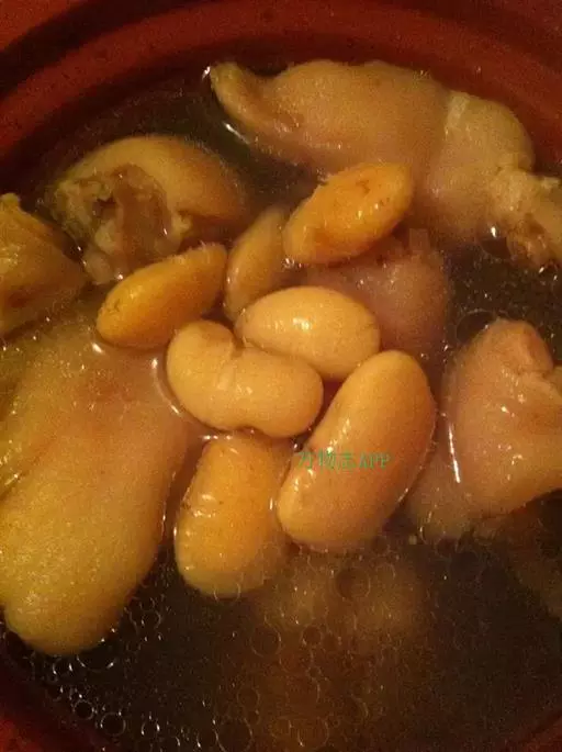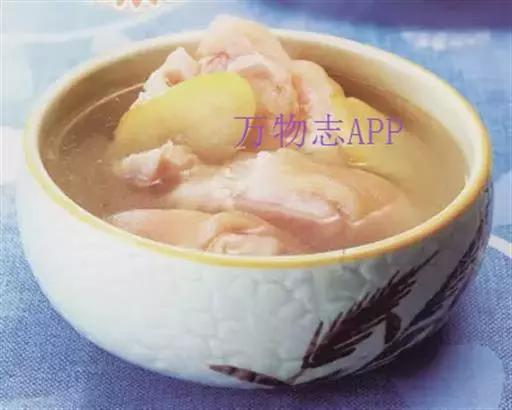 2、猪蹄洗净,放入锅中,放入生姜、绍酒和适量清水,以旺火煮开,改文火炖烂,加茭白片烧沸几分钟,加精盐调味即成。