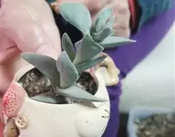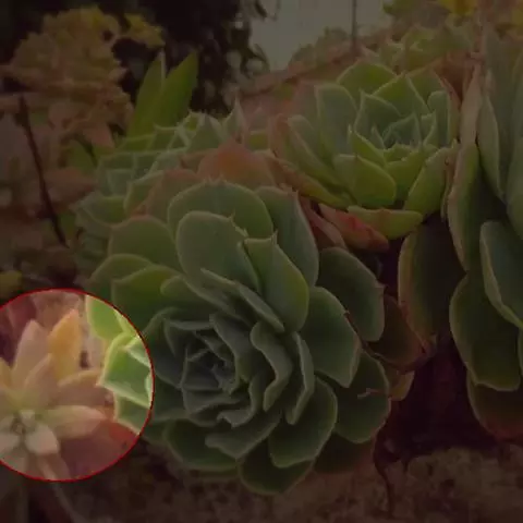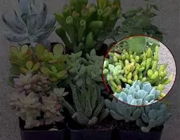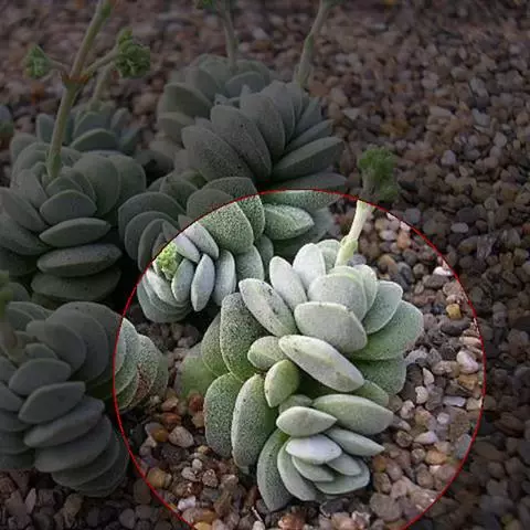 叶子表面宽厚,富肉质感且带有磨纱质感,看像石头质地;开红色小花,生于植株顶部,倒伞形密生,形状像花…