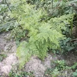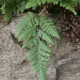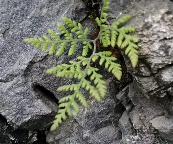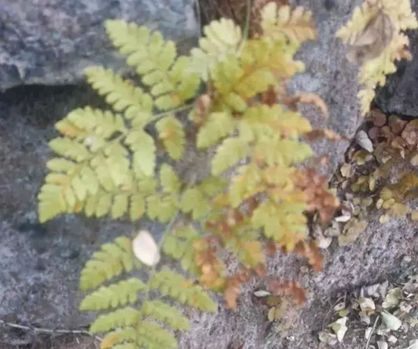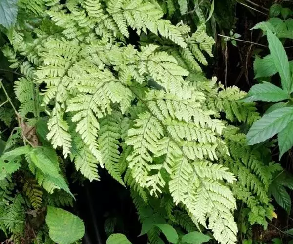 植株高(12-)20-50(-60)厘米。根状茎粗壮,横走,连同叶柄基部密被鳞片;鳞片长0.5-3厘米,狭披针形,先端渐狭成线形,全缘,膜质,亮红棕色。叶近生,柄长(5-)10-25(-30)厘米,粗1-3毫米,禾秆色,基部有时疏被较小的狭披针形鳞片,向上仅被灰白色柔毛;叶片长(7-)20-30厘米,基部宽(6-)18-30厘米,卵状五角形,先端渐尖并羽裂,基部圆心形,三回羽状;羽片8-12对,稍斜上,下部1-2对近对生,相距1.2-8厘米,向上互生;基部一对最大,长(3.5-)10-20厘米,基部宽(3-)5-10厘米,三角状长圆形,短渐尖头,基部心形,柄长(2-)5-10毫米,二回羽状;一回小羽片6-10对,上先出,互生,稍斜上,彼此接近,羽轴下侧的较上侧的为大,尤以基部一片最大,长(1.5-)3-7厘米,基部宽(1-)2-5厘米,卵状三角形,短渐尖头,基部近截形,下延成具狭翅的短柄,一回羽状;末回小羽片长(0.5-)1.5-2.5厘米,基部宽0.5-1厘米,长圆形,先端钝尖,基部多少与小羽轴合生,羽状深裂;裂片长圆形,先端圆钝,边缘全缘或略成波状;基部一对羽片的上侧小羽片长1-4厘米,基部宽0.5-2厘米,卵状三角形至长圆形,先端急尖,基部近平截,以狭翅下延,一回羽状深裂;第二对以上各对羽片向上渐次缩短,披针形或长圆披针形,先端短钝尖,基部圆截形或为浅心形,具短柄,二回羽裂;羽轴两侧的小羽片近等大。叶脉两面明显,侧脉羽状,单一,每末回裂片2-3对,斜上,伸达叶边;叶草质,干后黄绿色,两面连同叶轴和各回羽轴密被灰白色柔毛;羽轴下面偶有红棕色的线状披针形的狭鳞片。孢子囊群圆形,背生于侧脉中部,每裂片1-3枚;囊群盖大,肾形,浅灰色,膜质,背面密被柔毛,宿存。孢子深棕褐色,二面体形,单裂缝,赤道面观为肾形,极面观呈椭圆形,圆肾形,周壁具较密的褶皱,形成明显的弯曲条纹,表面光滑。孢子大小为46微米×56微米。 [2-3]