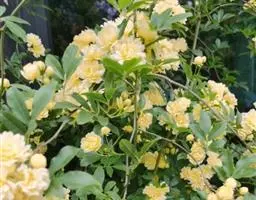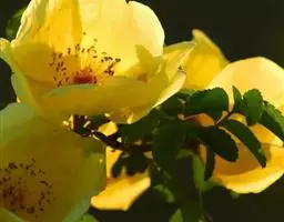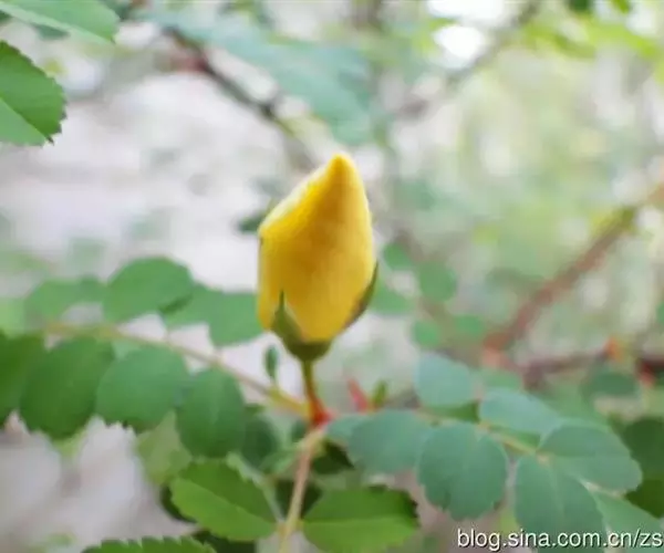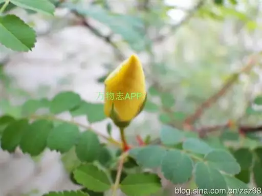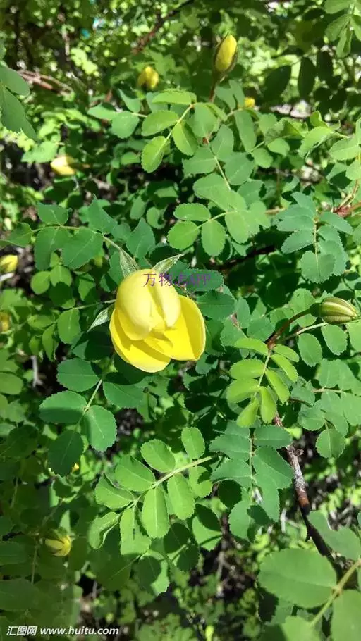 单瓣黄刺玫 是栽培黄刺玫的原始种。直立灌木,高2-3米;枝粗壮,密集,披散;小枝无毛,有散生皮刺,无针刺。小叶7-13,连叶柄长3-5厘米;小叶片宽卵形或近圆形,稀椭圆形,先端圆钝,基部宽楔形或近圆形,边缘有圆钝锯齿,上面无毛,幼嫩时下面有稀疏柔毛,逐渐脱落;叶轴、叶柄有稀疏柔毛和小皮刺;托叶带状披针形,大部贴生于叶柄,离生部分呈耳状,边缘有锯齿和腺。