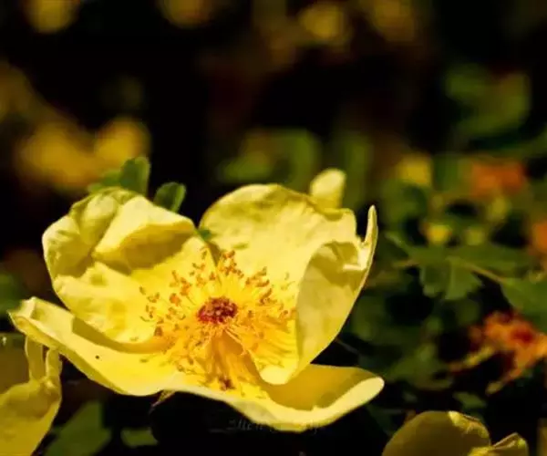 花单生于叶腋,单瓣,黄色,无苞片;花梗长1-1.5厘米,无毛,无腺;花直径3-4(-5)厘米;萼筒、萼片外面无毛,萼片披针形,全缘,先端渐尖,内面有稀疏柔毛,边缘较密;花瓣黄色,宽倒卵形,先端微凹,基部宽楔形;花柱离生,被长柔毛,稍伸出萼筒口外部,比雄蕊短很多。