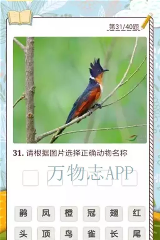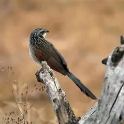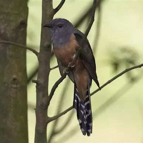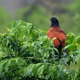 红翅凤头鹃(学名:Clamator coromandus):体长约38厘米,顶冠及凤头黑色,具显眼的直立凤头,背及尾黑色而带蓝色光泽,翅栗红色,喉及胸橙褐色,颈圈白色,腹部近白。虹膜淡红褐色。嘴黑色,下嘴基部近淡土黄色,嘴角肉红色,脚铅褐色。幼鸟上体褐色,具棕色端缘,下体白色。