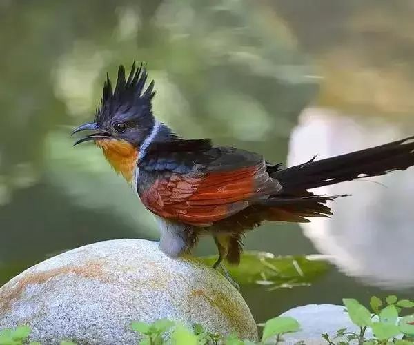 红翅凤头鹃:体长约38厘米,顶冠及凤头黑色,具显眼的直立凤头,背及尾黑色而带蓝色光泽,翅栗红色,…